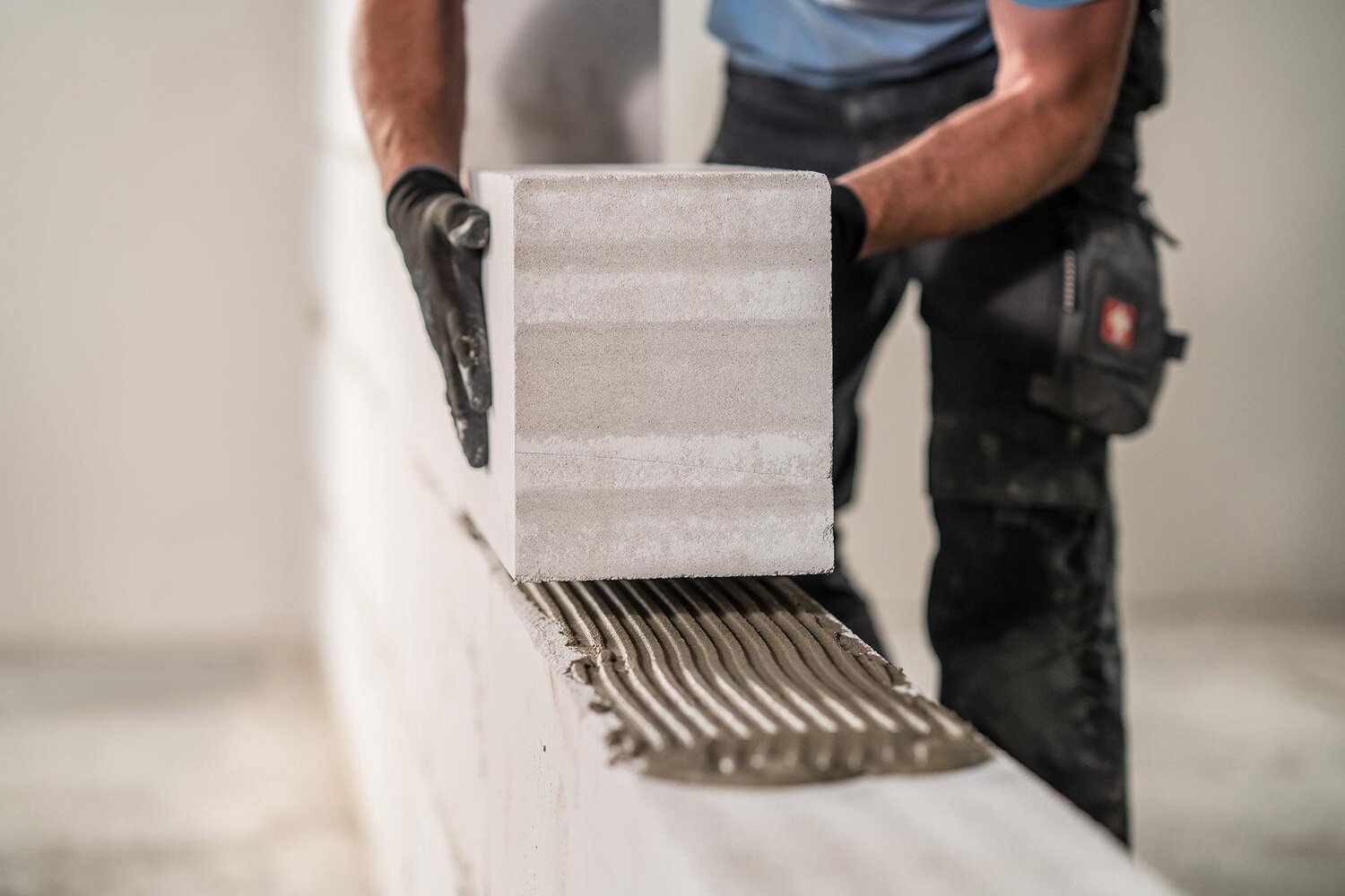 Для кладки из газо- и пенобетона обычно применяют тонкослойный раствор. Рекомендуемая толщина слоя раствора 1351 M5 составляет 3–5 мм, тогда как для обычных кладочных растворов она достигает 10–15 мм.